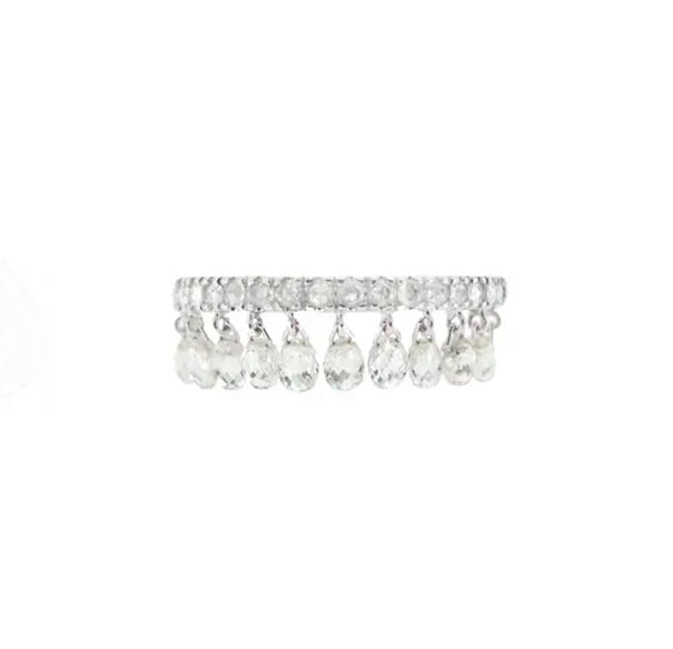 The ring features 11 briolette-cut diamonds, each suspended gracefully from a sleek diamond-encrusted band. The briolette diamonds, known for their teardrop shape and intricate faceting, dangle elegantly from the band, creating a shimmering, dynamic effect with every movement. The band itself is adorned with a continuous line of brilliant-cut diamonds, adding extra sparkle and elevating the ring’s luxurious appeal.