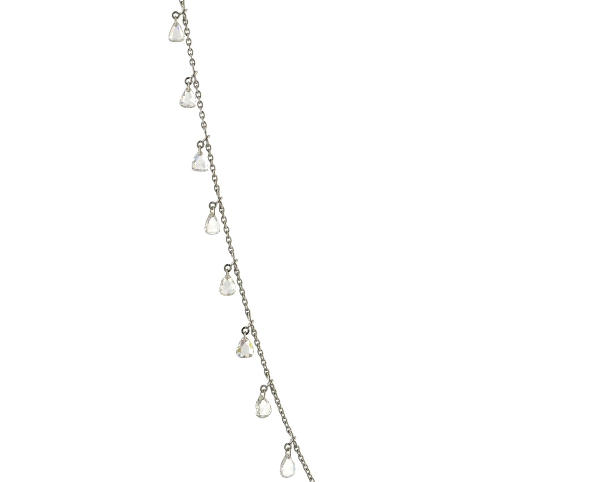 This delicate necklace features a minimalist design with multiple pear-shaped, rose-cut pierced diamonds evenly spaced along a fine chain. Pierced diamonds are attached with subtle loops to the chain, allowing them to move gently and catch the light with every movement.