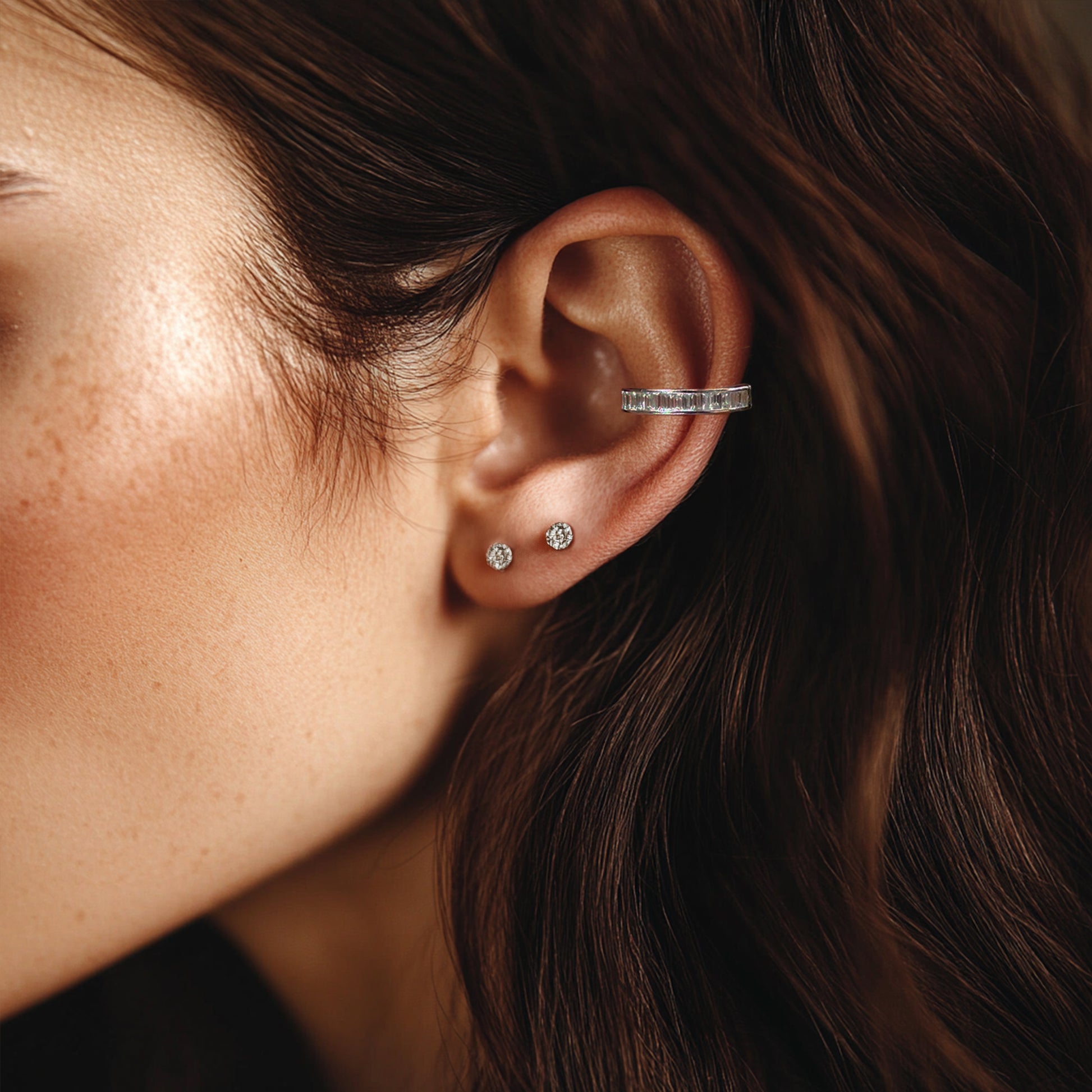 Statement ear cuff that features a delicate row of 46 baguette-cut diamonds effortlessly combines modern edge with timeless elegance.