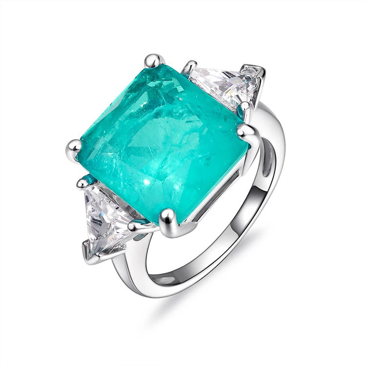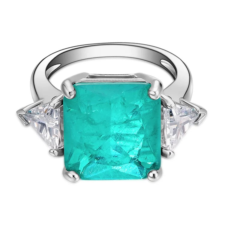 Make a statement with this absolutely classic ring featuring simulated tourmaline paraiba in emerald cut set between two trilliant-shaped white cubic zirconia gems.